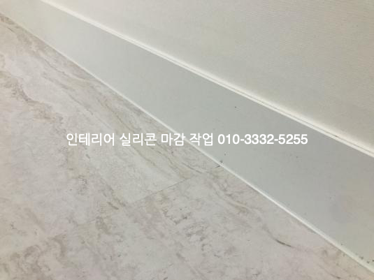 걸레받이와 바닥 데코타일이 만나는 모서리 부분은 백색 실리콘으로 코킹