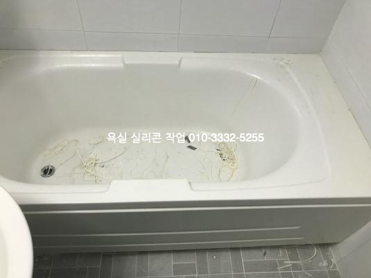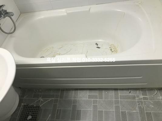 작업 전 사진 : 화장실 실리콘이 누렇게 변색이 되고 욕조 실리콘은 일부 들떠 있습니다.