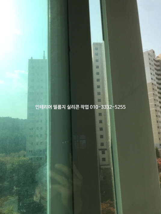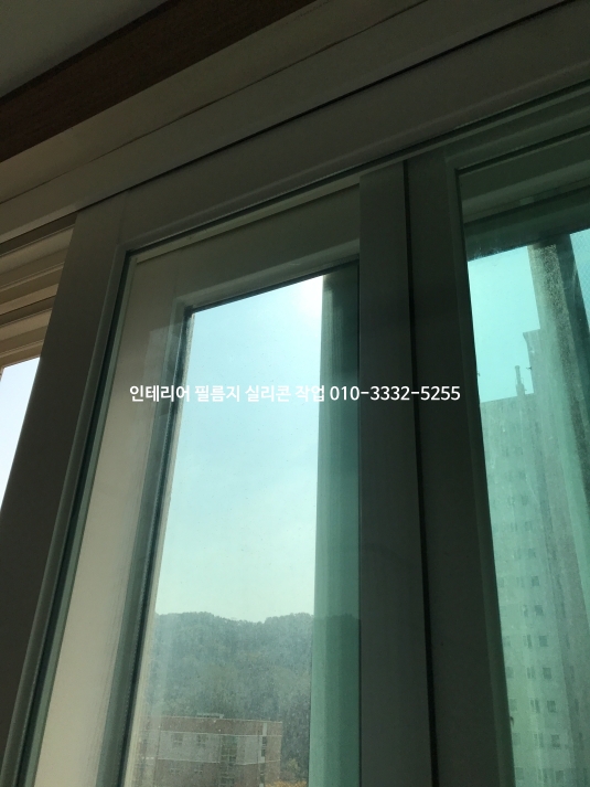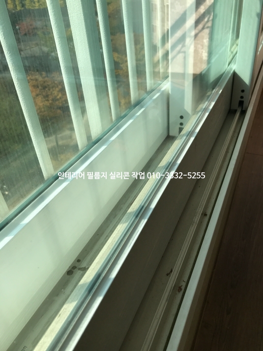 필름지 색상에 맞춰 백색 실리콘으로 새시와 유리 모서리 실리콘 작업한 사진입니다.