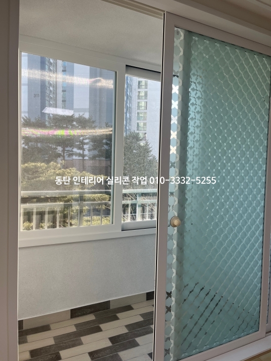 창틀 유리 실리콘 : 인테리어 필름지 시공이 되어 있는 거실, 방 샤시 유리 실리콘 코킹 사진