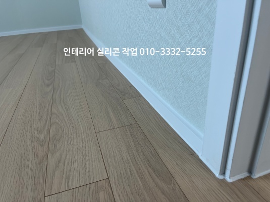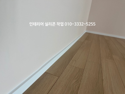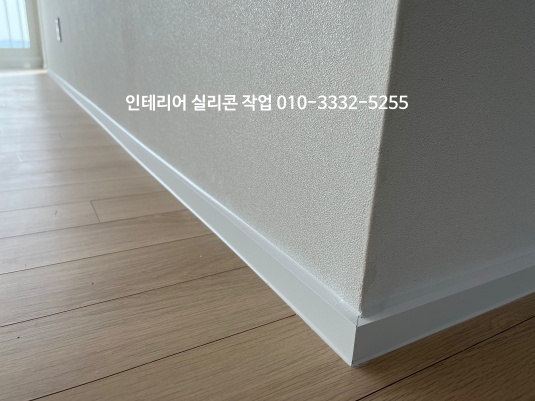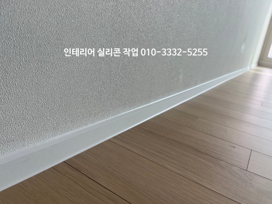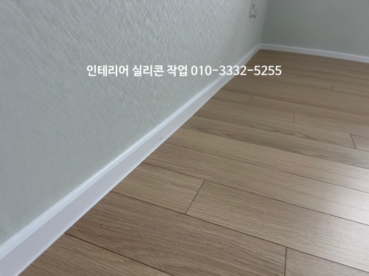 거실 도배지와 걸레받이가 만나는 곳, 걸레받이와 마루 바닥 모서리 부분 백색 실리콘으로 작업