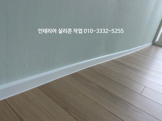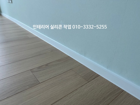 거실 도배지와 걸레받이가 만나는 곳, 걸레받이와 마루 바닥 모서리 부분 백색 실리콘으로 작업