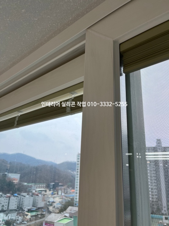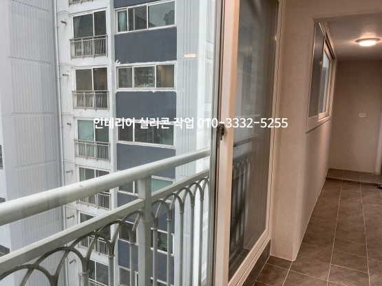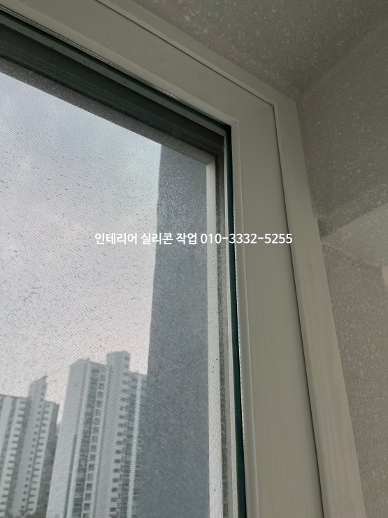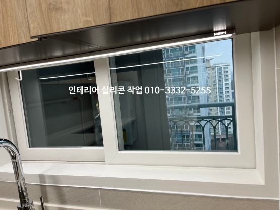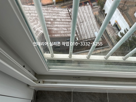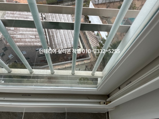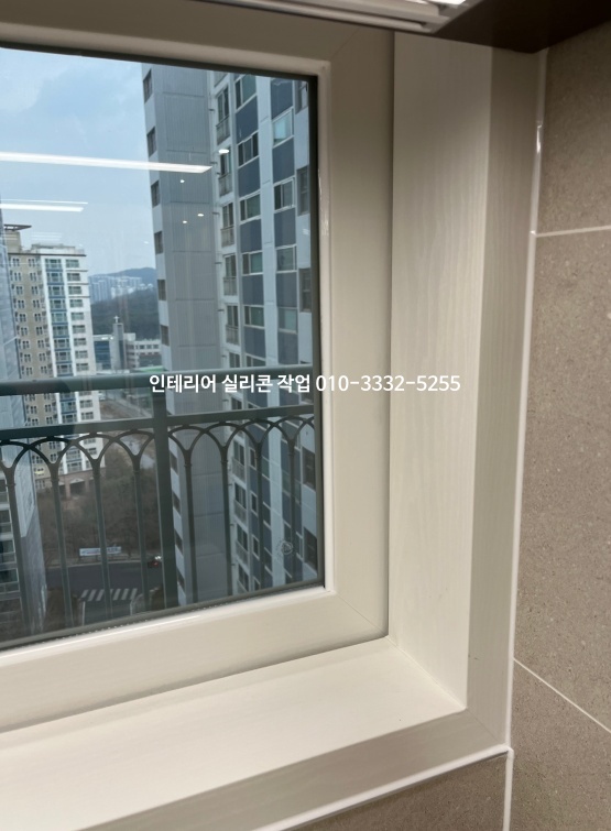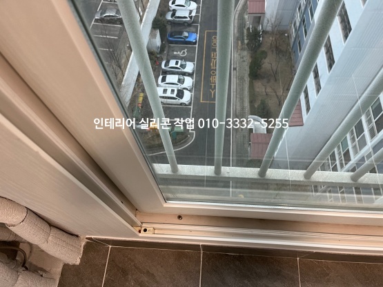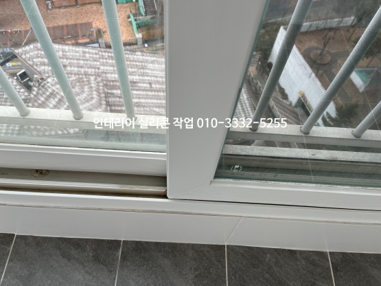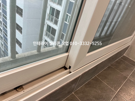 거실, 발코니, 방, 주방에 있는 창틀과 유리 모서리 실리콘 마감 작업한 사진