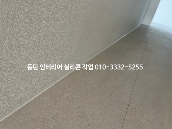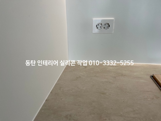 도배가 되어 있는 벽과 마루 바닥이 만나는 모서리 백색 실리콘으로 마감을 해주고