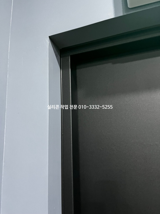 인테리어 필름지 시공이 되어있는 방화 문틀 실리콘 시공