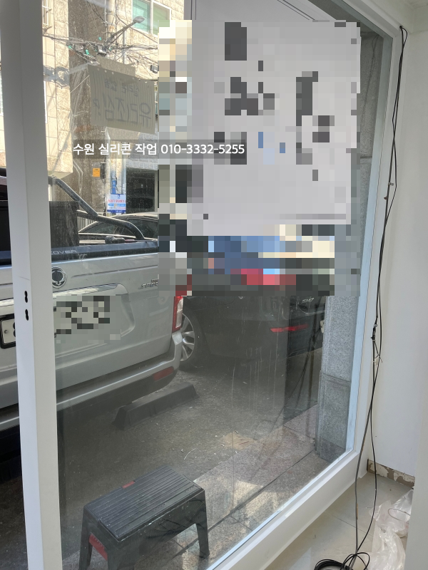 상가 전면 통 유리와 필름지 작업이 되어있는 프레임 만나는 모서리 앞, 뒤로 실리콘 작업