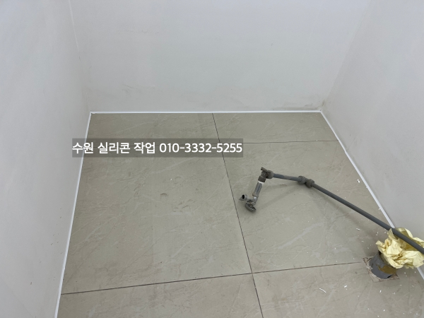 바닥 타일이 시공되어있는 벽 모서리 실리콘 마감