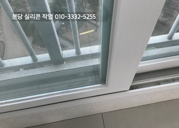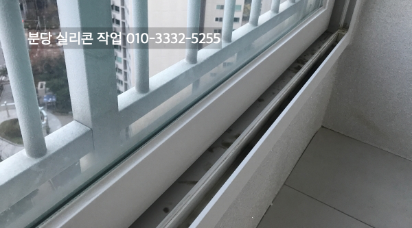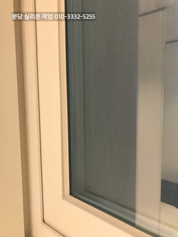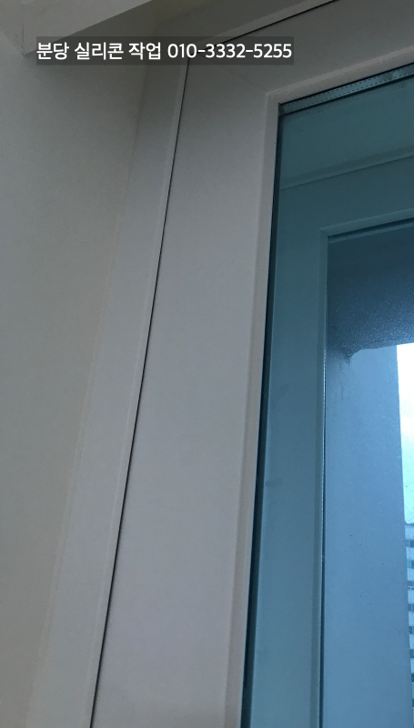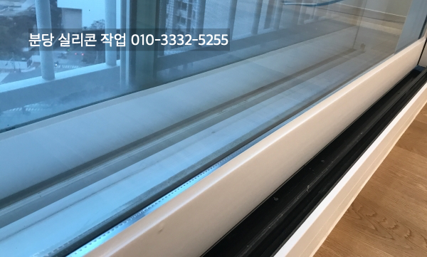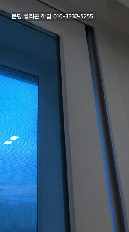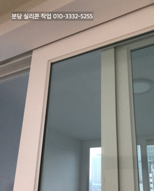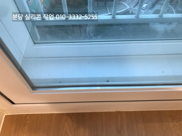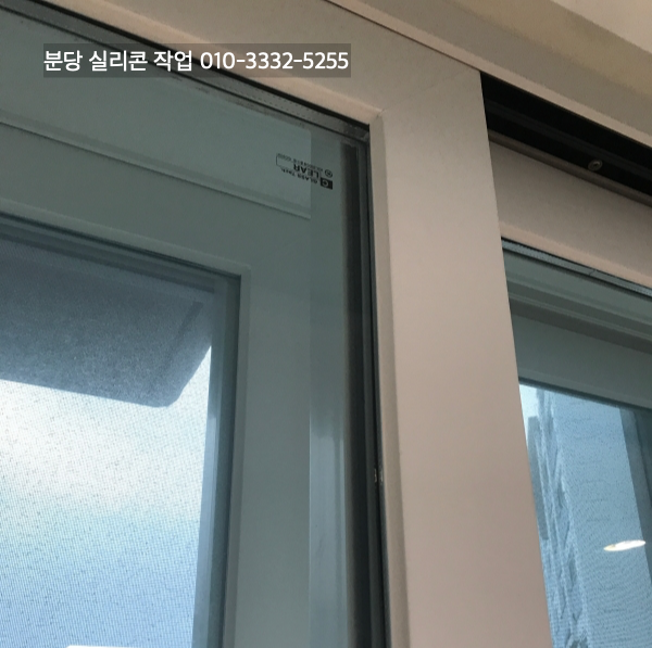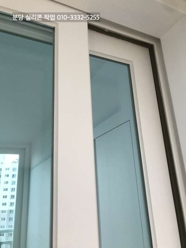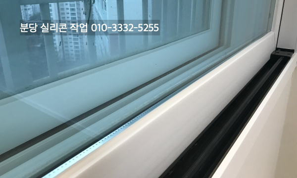 분당 아파트 인테리어 필름지 시공이 되어 있는 창틀 유리 실리콘 작업