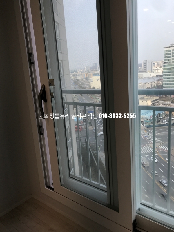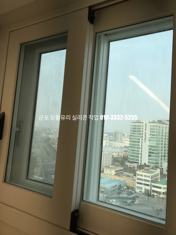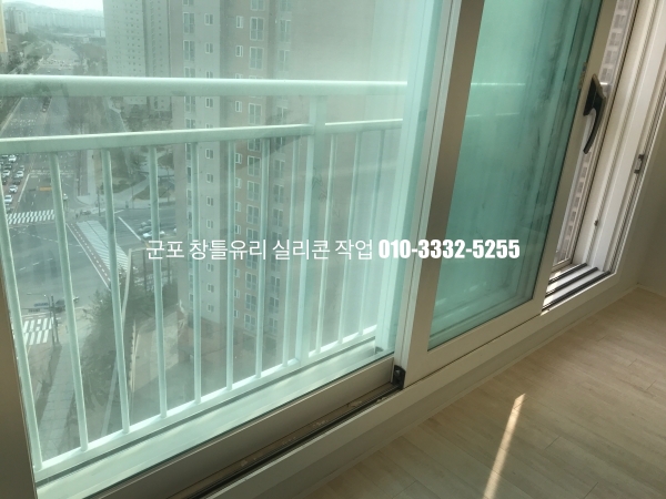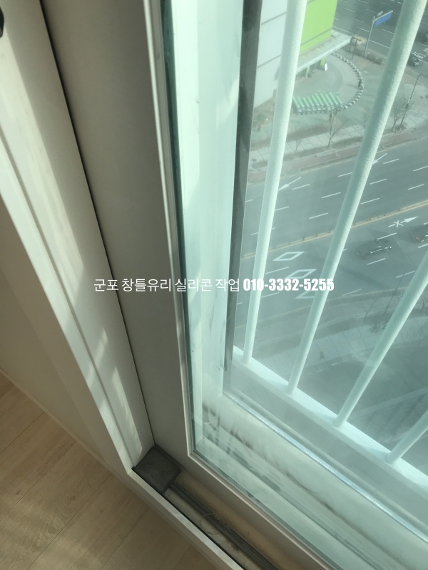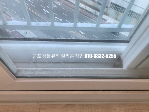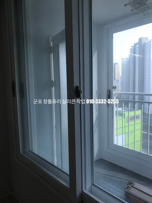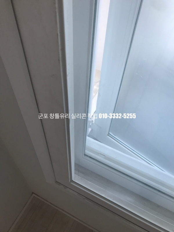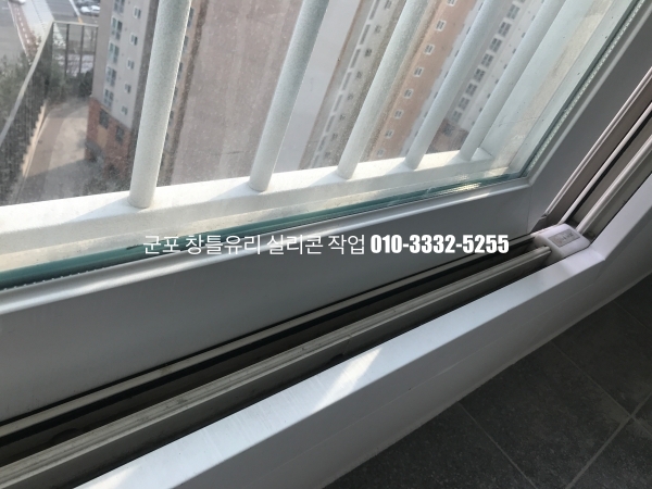 군포 창틀유리 실리콘 작업 : 필름지 시공이 되어 있는 새시 실리콘 마감