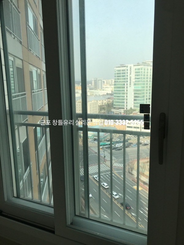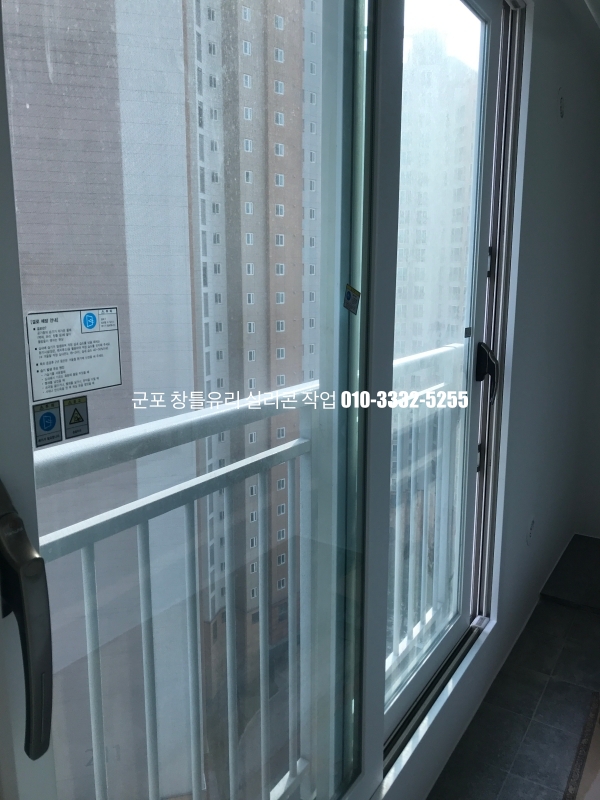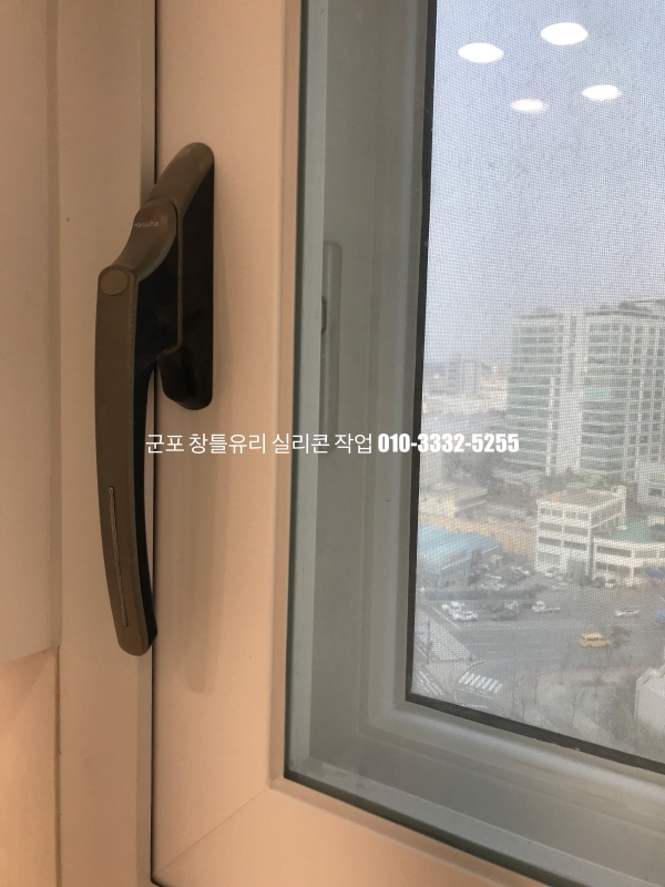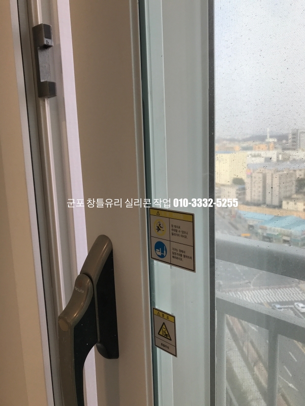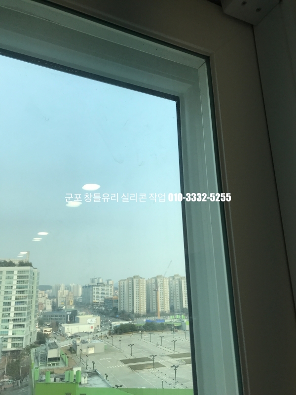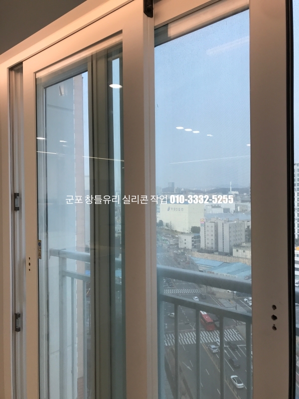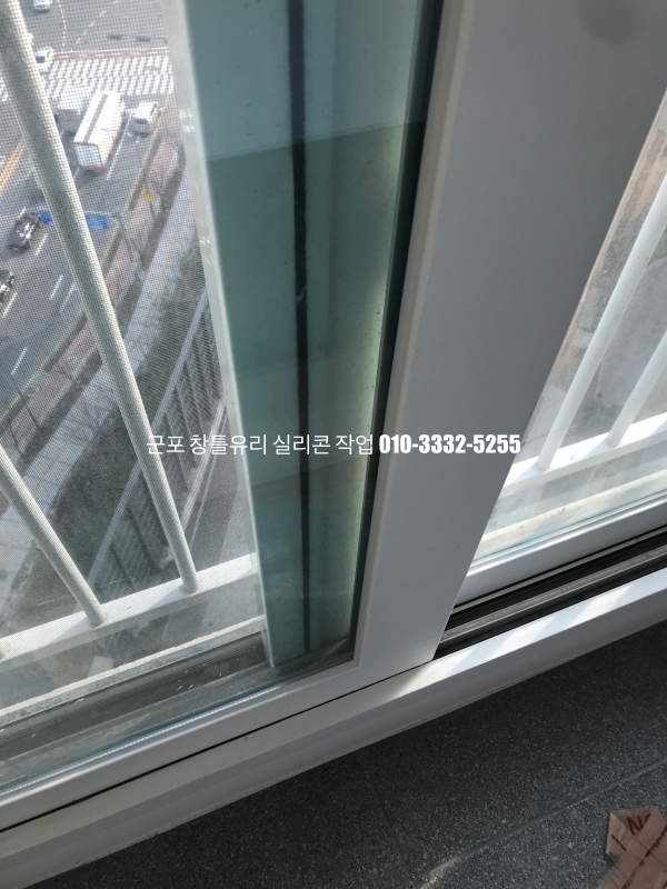 군포 창틀유리 실리콘 작업 : 필름지 시공이 되어 있는 새시 실리콘 마감