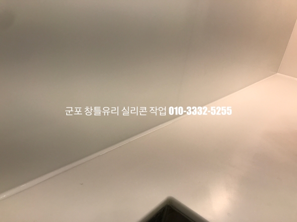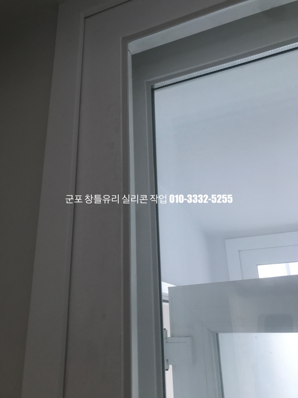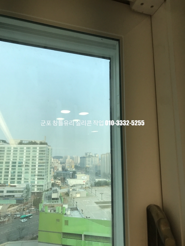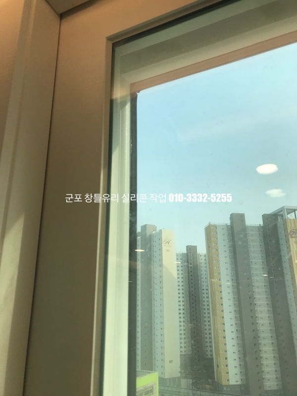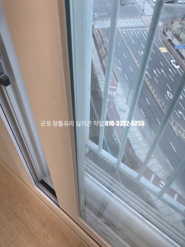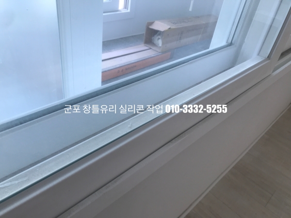 군포 창틀유리 실리콘 작업 : 필름지 시공이 되어 있는 새시 실리콘 마감