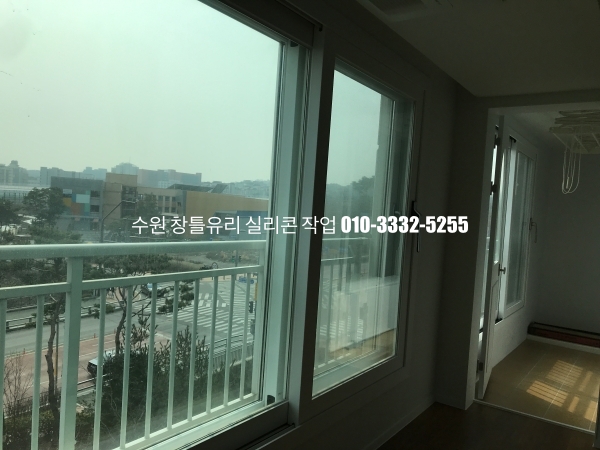 수원 아파트 창틀 유리 실리콘 작업 : 인테리어 필름지 시공이 되어 있는 새시 실리콘 코킹