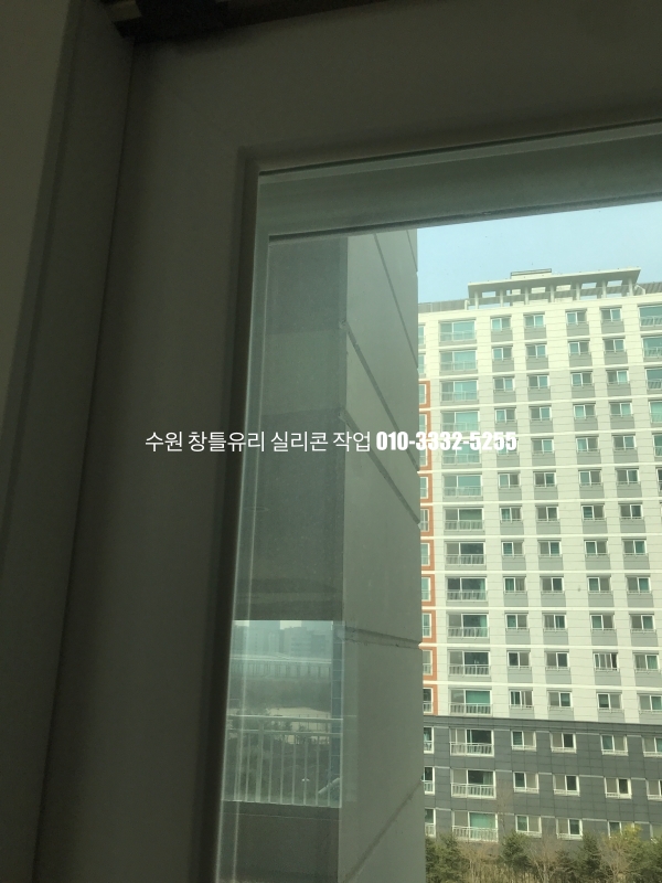 수원 아파트 창틀 유리 실리콘 작업 : 인테리어 필름지 시공이 되어 있는 샤시 실리콘 코킹