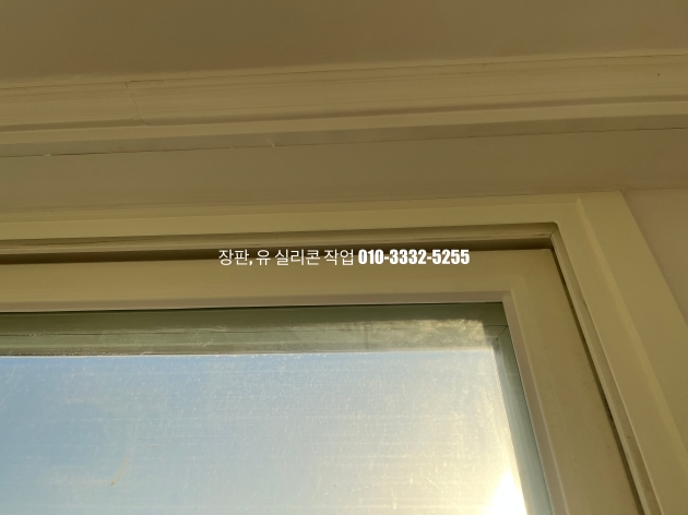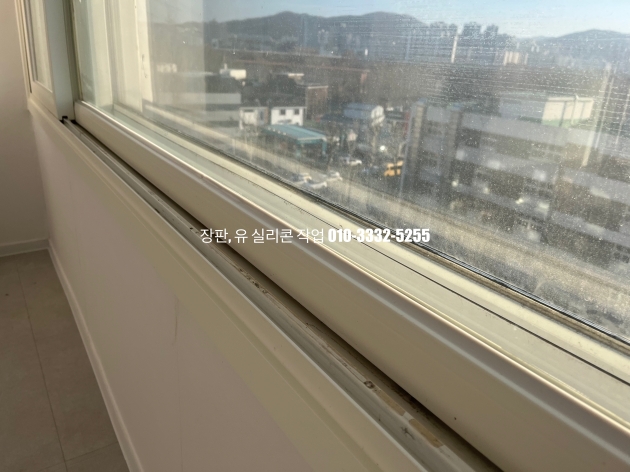 필름지 시공이 되어 있는 거실, 방 창틀 유리도 실리콘 작업하고