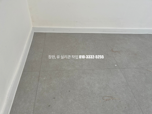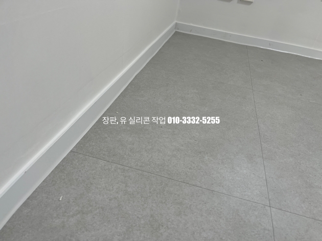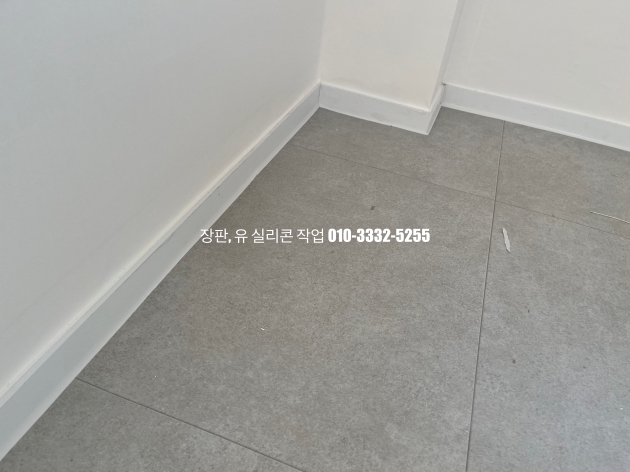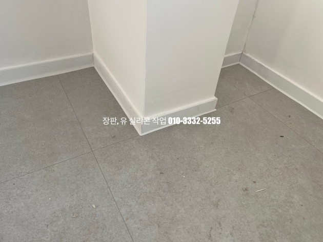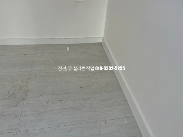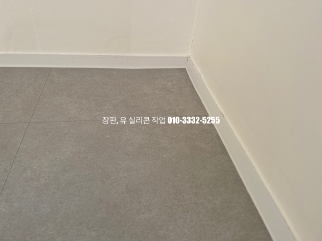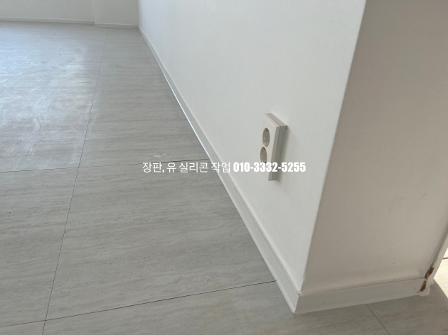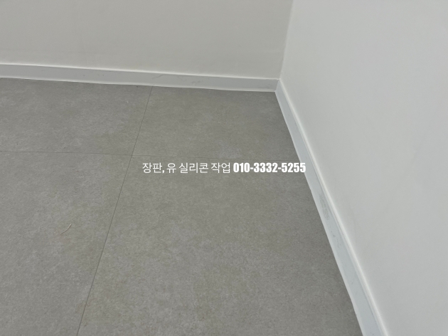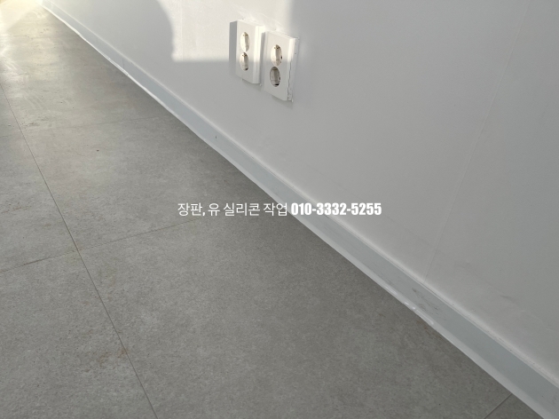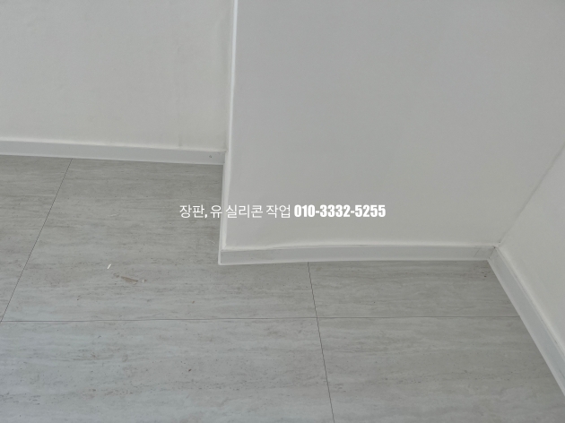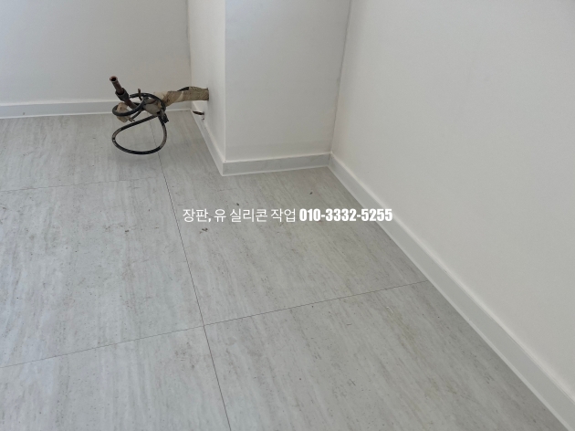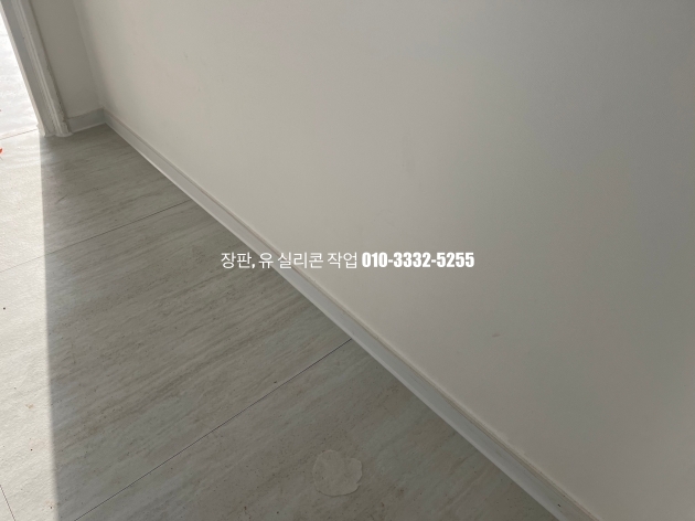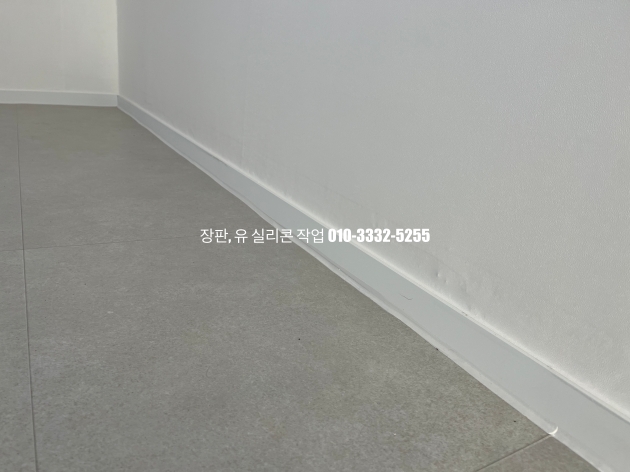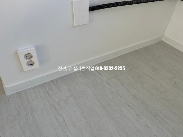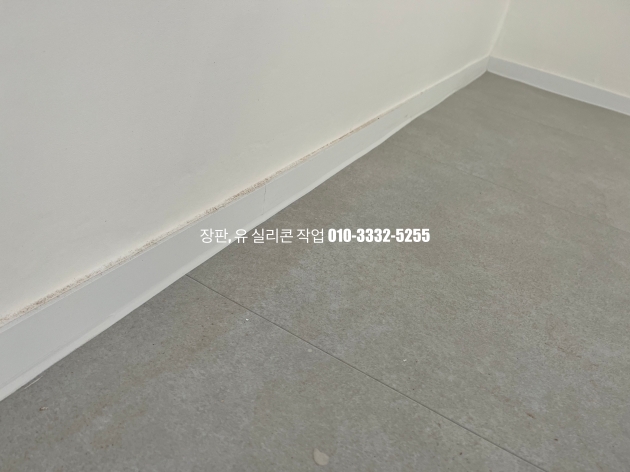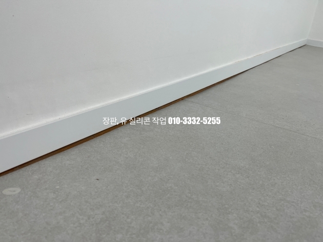 틈 간격에 맞춰 장판이 깔려있는 바닥 전체 걸레받이 백색으로 실리콘 작업을 하고